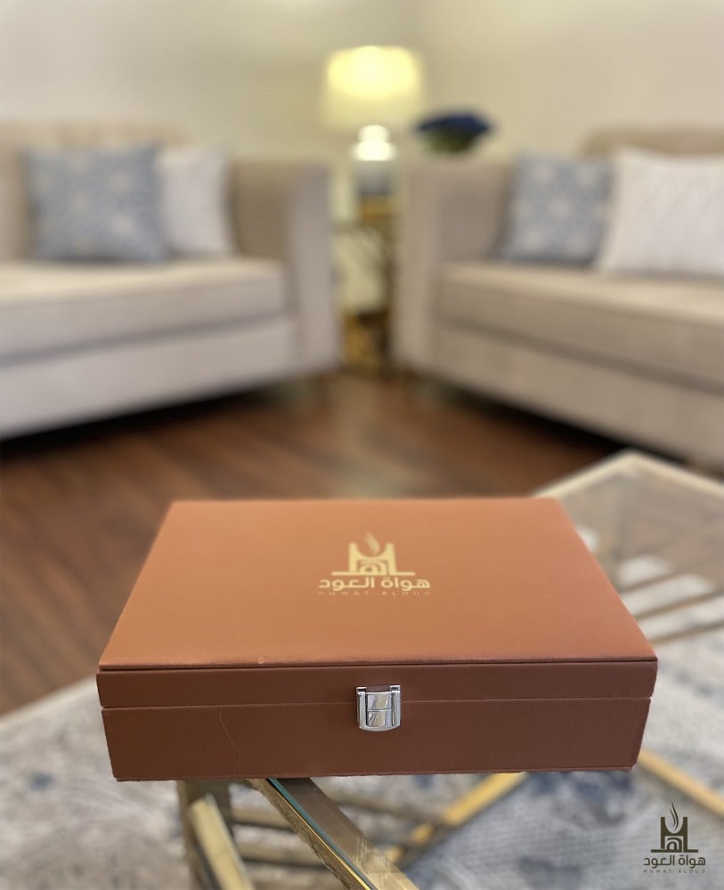 طقم إهداء من الجلد الإيطالي الفاخر باللون البني الرملي بداخلية قماشية من المخمل الفرنسي الفاخر، يحتوي على ربع تولة من الأدهان التي تناسبكم من وسم (الأدهان)، بالإضافة إلى قسمين خاصة بالخور من اختياركم من وسم (بخور علب الإهداء) ..