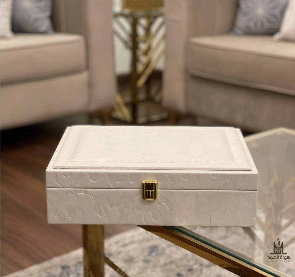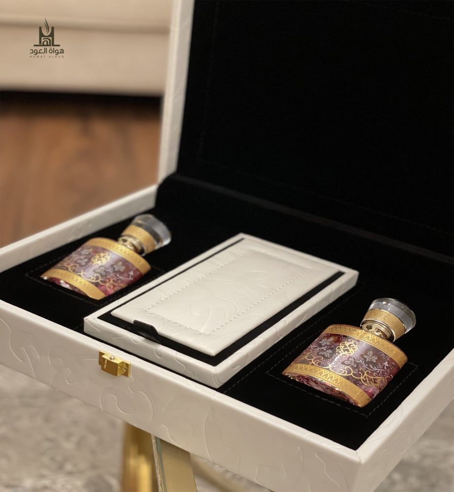 طقم إهداء فاخر باللون الأبيض، يحتوي على كرستالتين تَسع رُبعي تولة من الأدهان التي تناسبكم من وسم (الأدهان)، بالإضافة إلى بخور من اختياركم من وسم (بخور علب الإهداء) ..