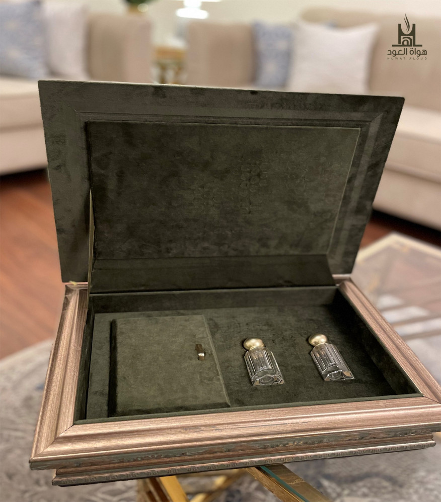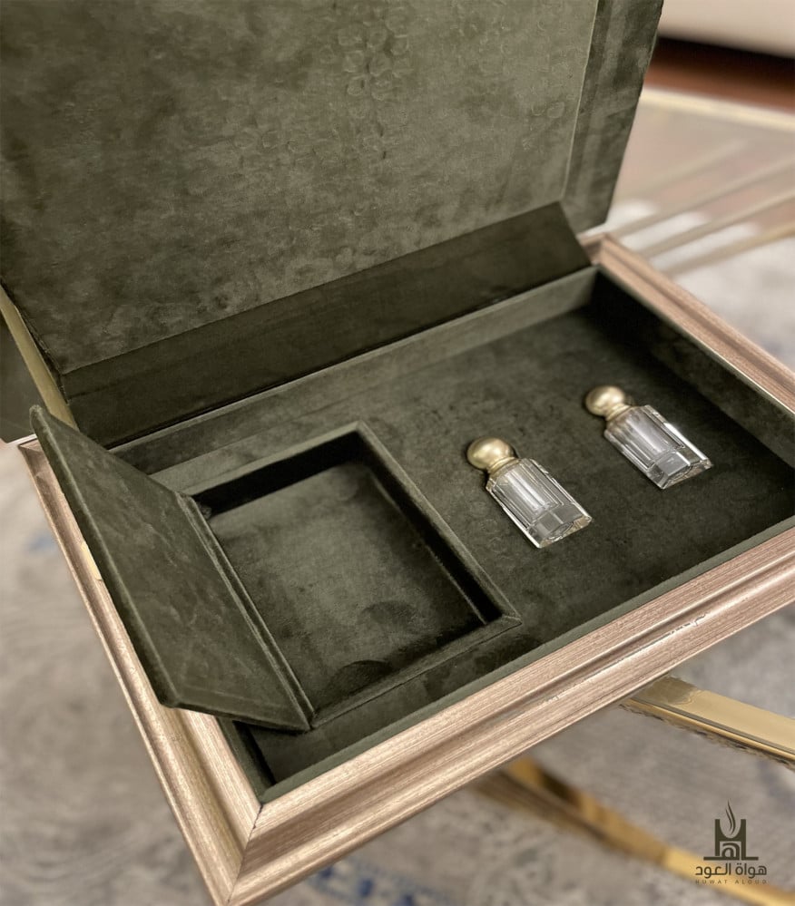 طقم إهداء خشبي فاخر مزين بالقماش المخملي باللون الزيتي الجميل، يحتوي على كرستالتين تَسع رُبعي تولة من الأدهان التي تناسبكم من وسم (الأدهان)، بالإضافة إلى بخور من اختياركم من وسم (بخور علب الإهداء) ..