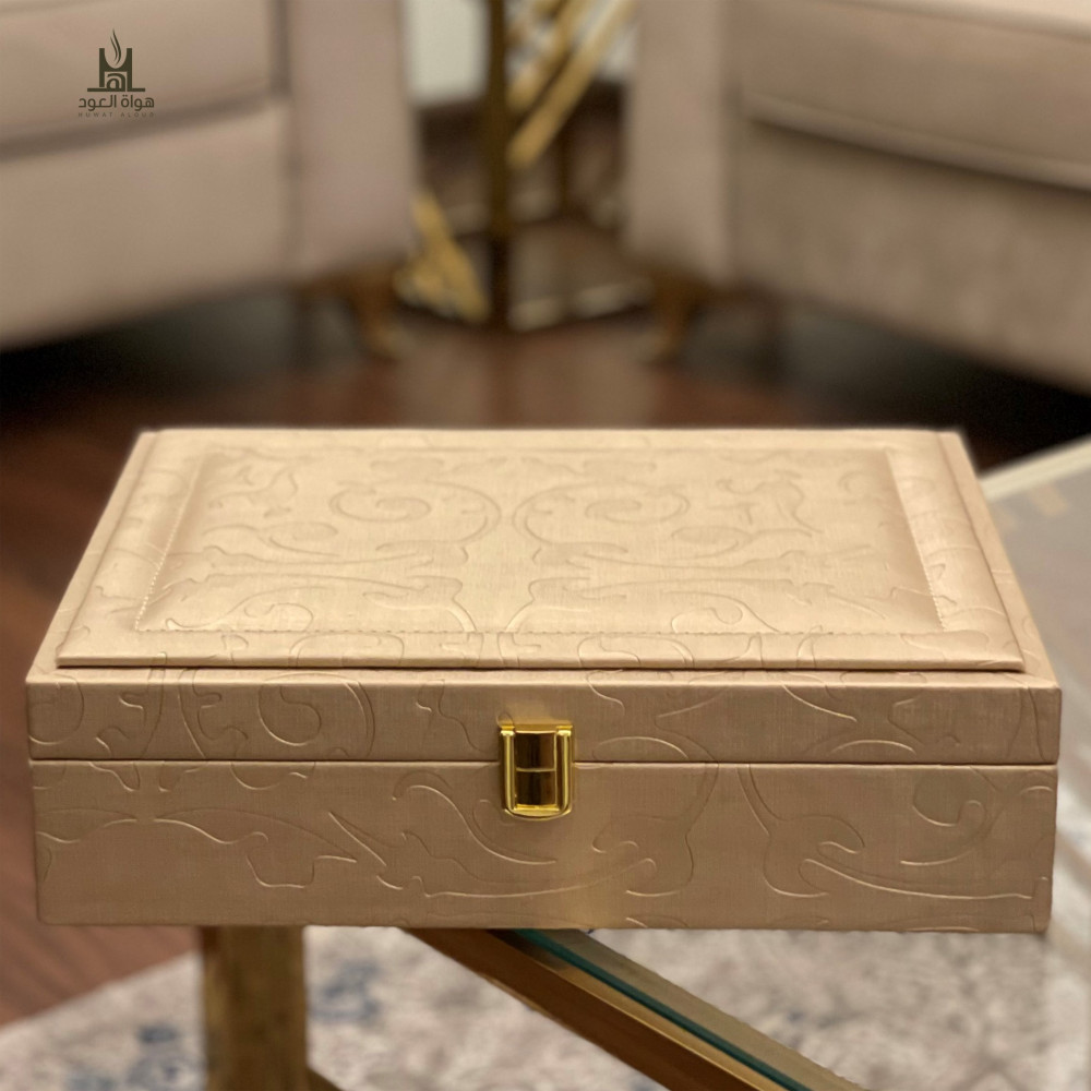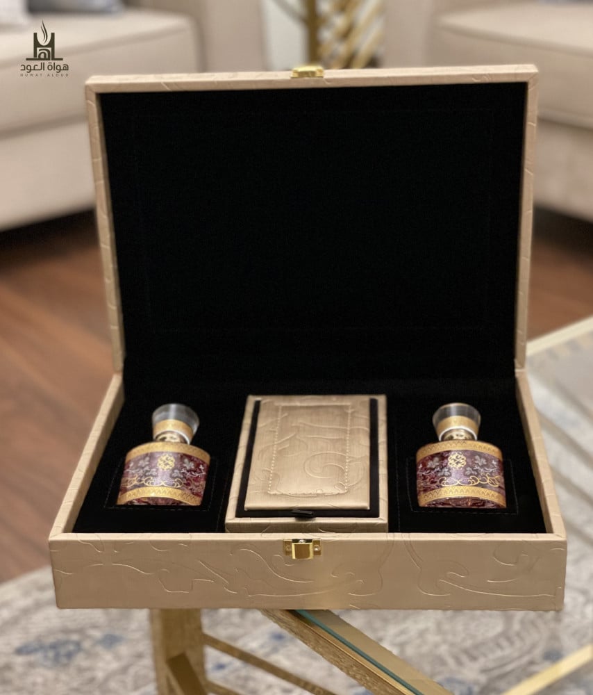 طقم إهداء فاخر باللون الذهبي، يحتوي على كرستالتين تَسع رُبعي تولة من الأدهان التي تناسبكم من وسم (الأدهان)، بالإضافة إلى بخور من اختياركم من وسم (بخور علب الإهداء) ..