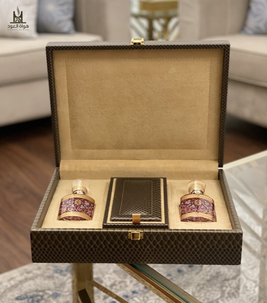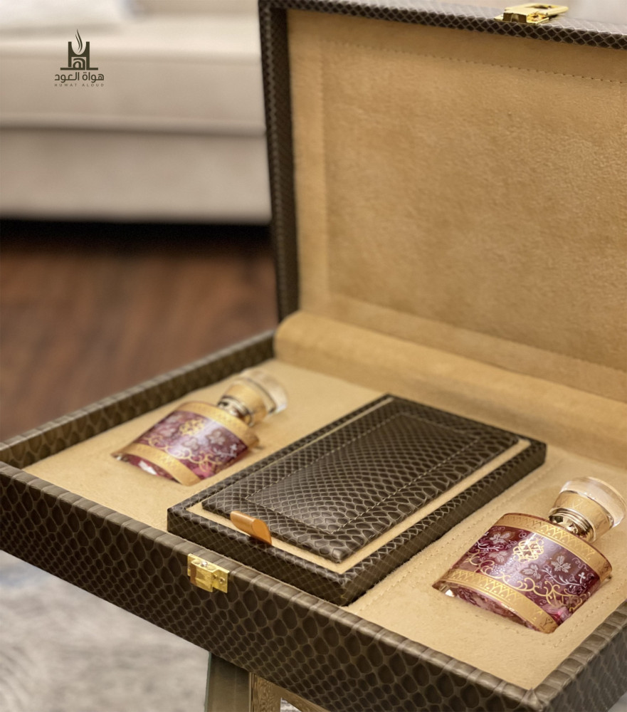 طقم إهداء فاخر بنقش جلد الثعبان باللون البني المتدرج، يحتوي على كرستالتين تَسع رُبعي تولة من الأدهان التي تناسبكم من وسم (الأدهان)، بالإضافة إلى بخور من اختياركم من وسم (بخور علب الإهداء) ..