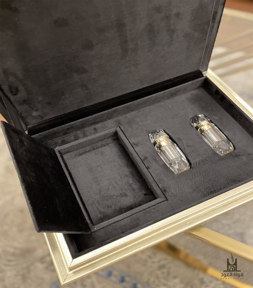طقم إهداء خشبي فاخر مزين بالقماش المخملي باللون الأسود الجميل، يحتوي على كرستالتين تَسع رُبعي تولة من الأدهان التي تناسبكم من وسم (الأدهان)، بالإضافة إلى بخور من اختياركم من وسم (بخور علب الإهداء) ..
